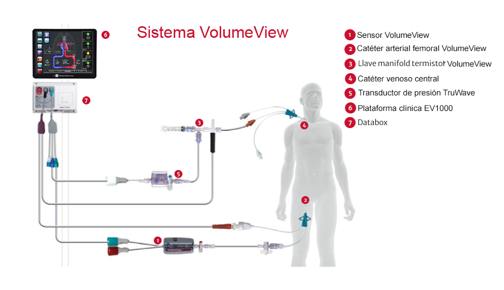 Diseñado para utilizarse en la monitorización de enfermos graves, el sistema VolumeView, combinado con el monitor EV1000, ofrece parámetros volumétricos informativos (IAPEV, IPVP, VTDG y FEG) que se pueden usar específicamente en el tratamiento del edema pulmonar, la lesión pulmonar aguda (LPA) o el síndrome de dificultad respiratoria aguda (SDRA). Los parámetros volumétricos se proporcionan a través de termodilución transpulmonar (TPTD). El sistema VolumeView está indicado para su uso en pacientes que requieren cuidados críticos en quienes la función cardíaca, el estado de fluidos y la resistencia vascular deben evaluarse de manera constante o intermitente. El catéter arterial femoral está indicado para la inserción de la arteria femoral.