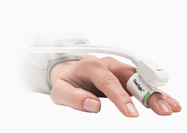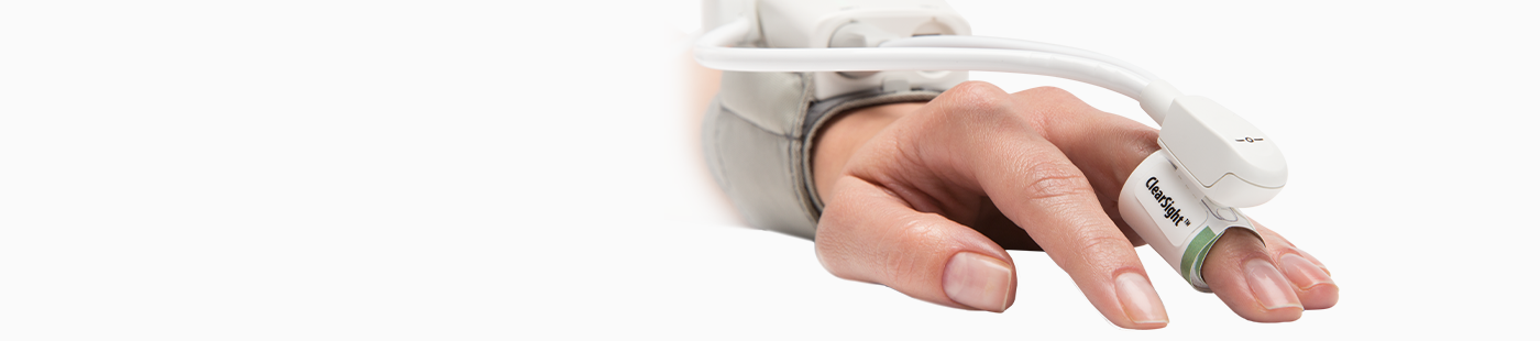 Il sistema ClearSight fornisce continuamente i valori della pressione sanguigna e dei parametri emodinamici avanzati da una fascetta per dito non invasiva.