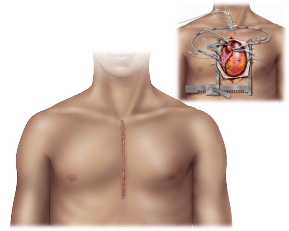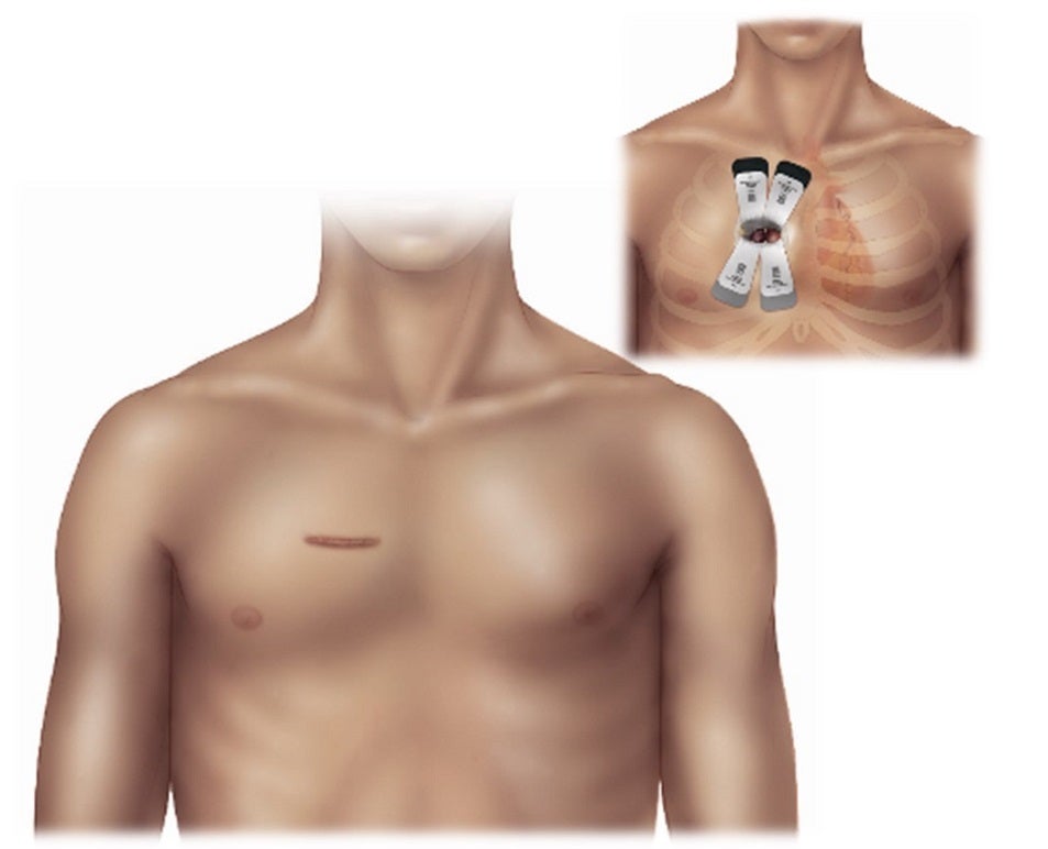 ![]() 胸骨正中切開。安定した実績のある一般的な手術法で、医師は広い視野とスペースで手術を行うことができる | ![]() MICS。胸骨を切らないため傷口は小さく、術後の回復が早い傾向があるが、術者は狭い視野とスペースでの手術が必要 |