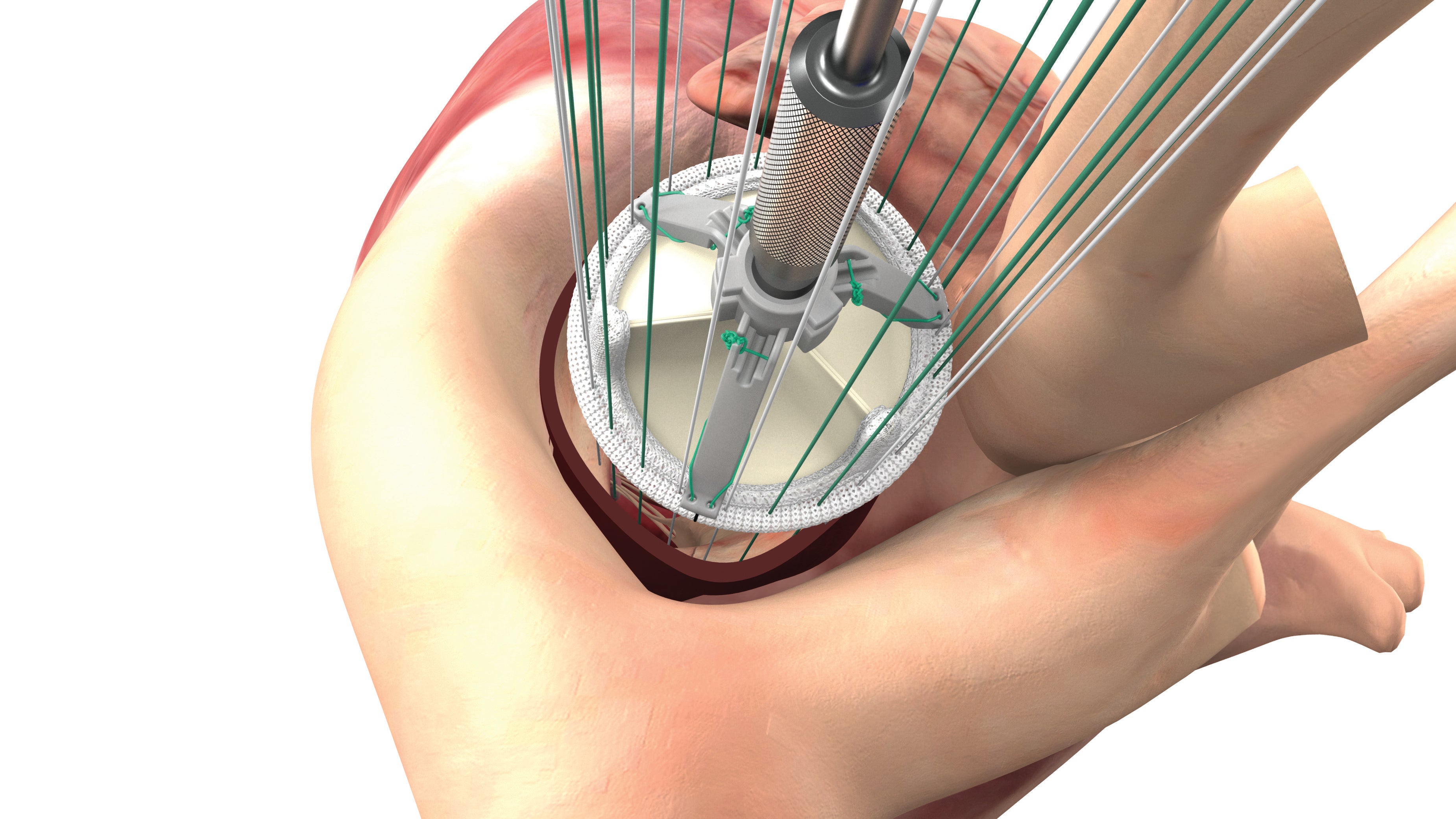 従来の人工弁は、12本~15本の糸を1本ずつ結んで固定します。この複雑な固定法が、狭い傷口から手術を行うMICSの難易度が上がる要因のひとつでした。一方、新製品のINTUITY Eliteは、わずか3本の糸と、バルーンで拡張したフレームによって圧着固定し、留置するため、手術時間を短縮することができます。弁留置の手順を簡素化することで、よりMICSや複合手術に適した特徴を持つ、手術時間短縮に貢献する人工弁となっています。