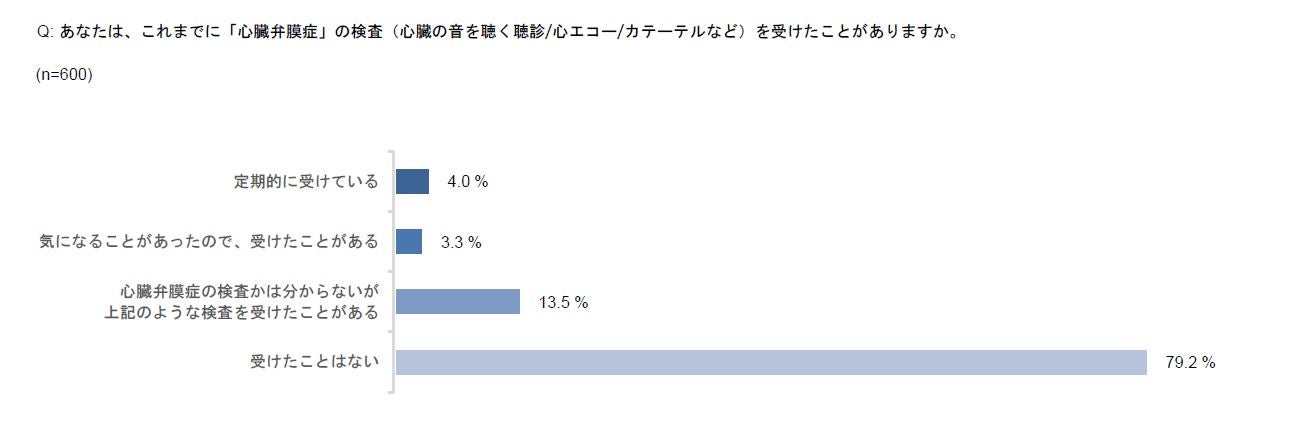 ー これまでに「心臓弁膜症」の検査(心臓の音を聴く聴診/心エコー/カテーテルなど)を受けたことがあるかを聞いた質問では、「定期的に受けている」「気になることがあったので受けたことがある」から「心臓弁膜症の検査かはわからないが、上記のような検査を受けたことがある」までを含めても、全体のわずか20.8%であり、心臓弁膜症の検査率は低い実態が判明した。