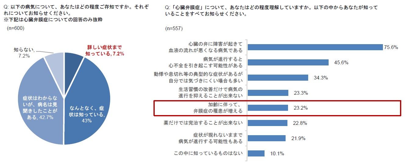 心臓弁膜症、詳しい症状理解は1割未満、加齢との関係認知も2割に留まる、8割は検査を受けたことがないと回答。心臓弁膜症に関する意識調査