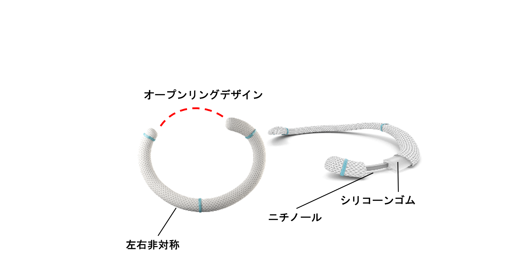 本製品は、共同開発者にマウントサイナイ病院*3の心臓血管外科医、デイヴィッド・アダムス医師を迎え、その臨床知見に基づいて開発されました。僧帽弁に隣接する大動脈弁の位置は患者さんによって異なるため、それに対応すること、また血液の流入を阻害しないことを目指し、大動脈弁に当たる部分を開放部位とするオープンリングデザインを採用しました。また右線維三角(僧帽弁・三尖弁と大動脈に囲まれた部位)を確実にとらえることが長期成績の向上につながると考え、左右非対称の独自の形状を採用しています。